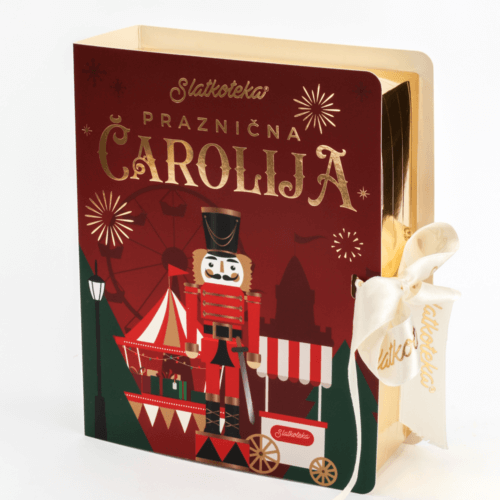 Mini zalogaji brauni kolača u obliku poklona i zvezde preliveni mlečnom čokoladom. Upakovano u premium kutiju u obliku knjige sa satenskom trakom i motivima novogodišnjih praznika. Na poleđini kutije se nalazi mesto za vašu personalizovanu poruku. Težina 650g.